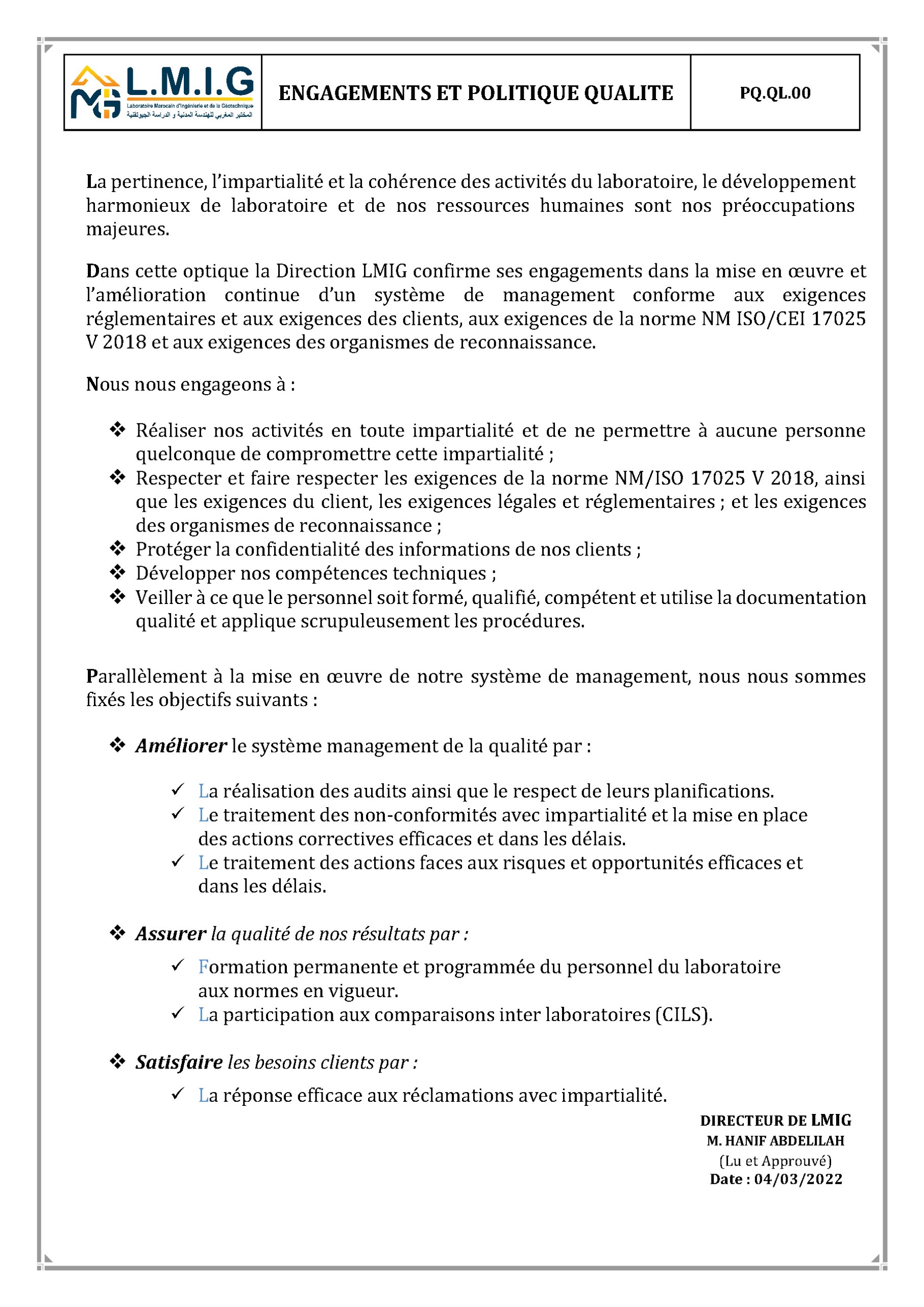 ENGAGEMENT ET POLITIQUE QUALITE – LMIG